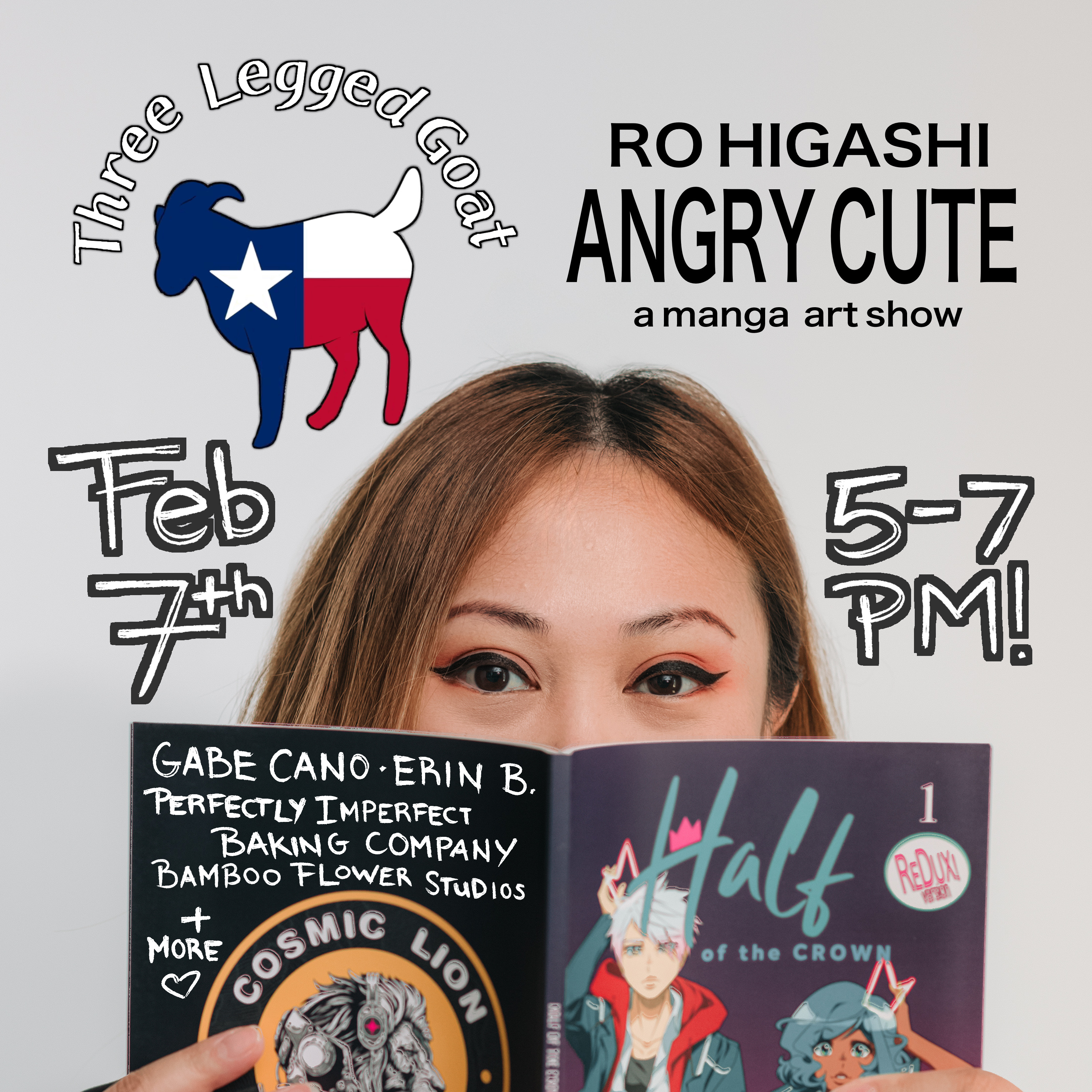Ro Higashi is an indie comics creator based in Austin, Texas. They are also the head of the manga department at Cosmic Lion, an independent comics publisher in Los Angeles. This is their first solo art exhibition, showcasing work that balances raw anger with the deeply human urge toward cuteness.